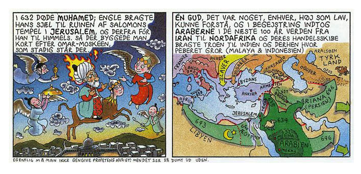 Carl Barks og Storm P, Holger Philipsen og Vilhelm Hansen er måske ikke lige stor verdenskunst altsammen, men tag ikke fejl: Claus Deleuran slugte viden i samme takt, som vi andre trækker vejret, også på billedområdet. Så hans tegninger rummer også venlige hilsener til f.eks. Gustave Dorés syn på Djævelen, til Lorenz Frölichs senromantiske eller før-Jugend syner af den tidlige Danmarkshistorie, til middelalderens kalkmalerier og moraliserende piktogrammer såvel som til alle 1950ernes danske annonceillustrationer. For nu slet ikke at tale om, at han i sjette bind af ’Illustreret Danmarkshistorie for Folket’, længe før enhver Muhammed-krise, har afbildet profeten selv på vej til himmels og trods forbuddet hele hans ansigt med – ”for det ser så dumt ud uden hoved”.